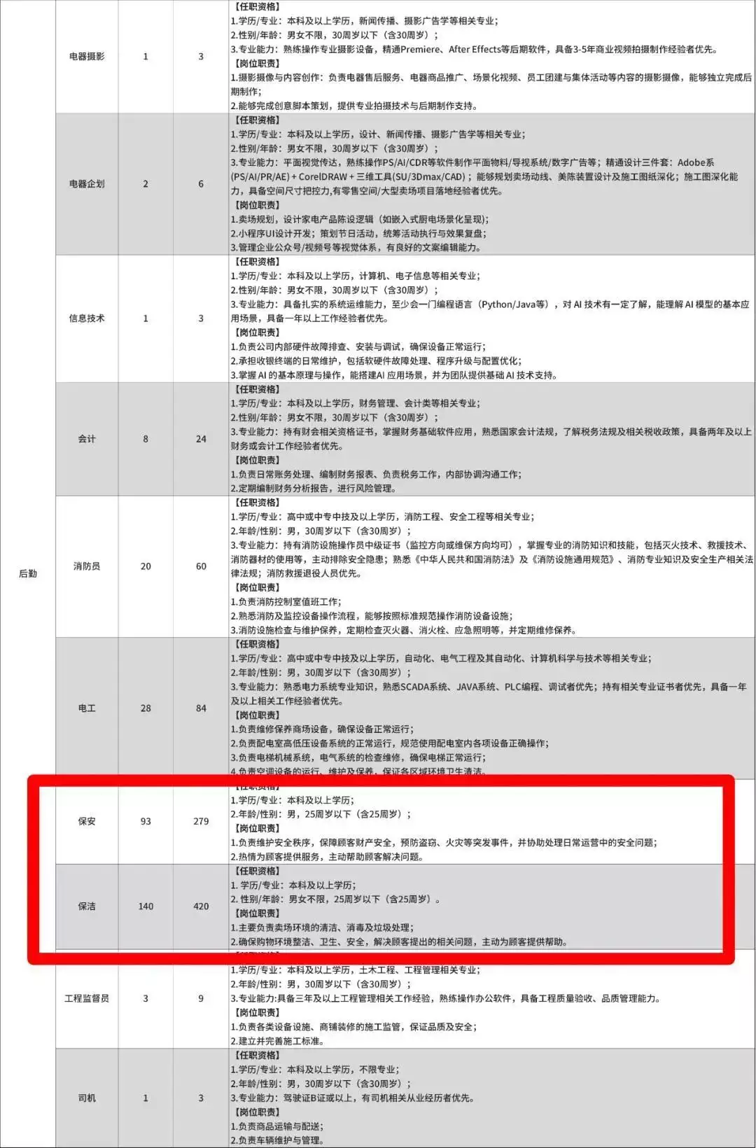 记者注意到,在《新乡胖东来招聘公告》中,实际上,除服装售后、超市烘焙师、厨师、消防员、电工外,其余岗位的基本要求均为本科及以上学历,年龄普遍要求30岁以下。保洁拟招聘140人,保安拟招聘93人。